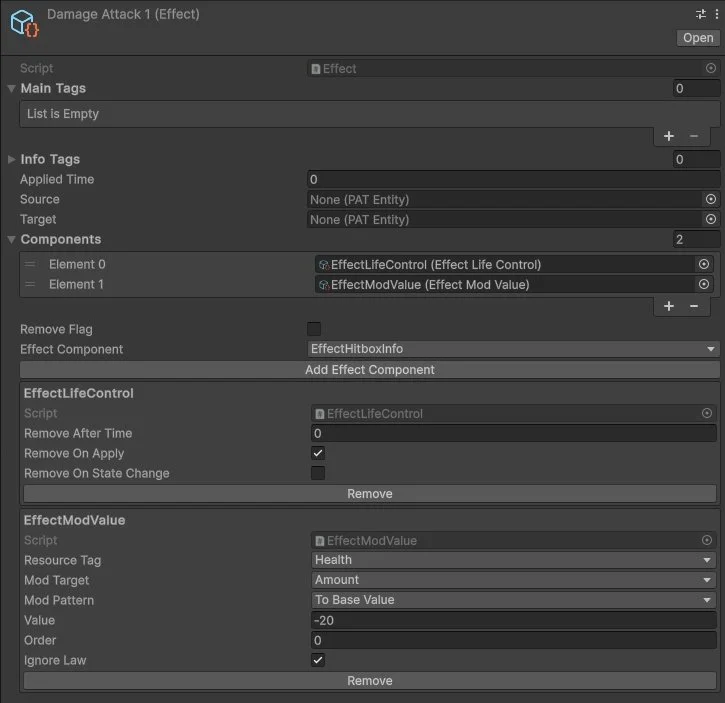 Effect are kind of a data container for PAT Character to communicate with each other. You can also add behavior to it to achieve some thing as it works parallels with Action State. Effect itself simply have some tags. You can control the behavior by adding components on it, similar to action state.
